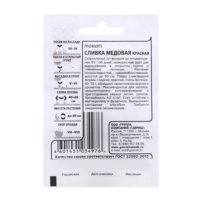 Семена Томат "Сливка медовая", красная, б/п, 0,05 г — Характеристики
