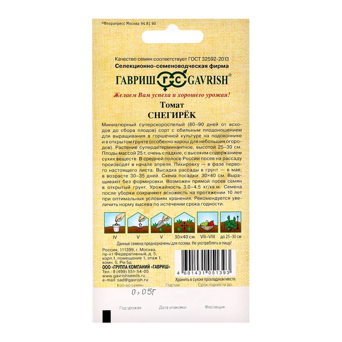 Семена Томат "Снегирек", суперскороспелый, 0,05 г — Характеристики