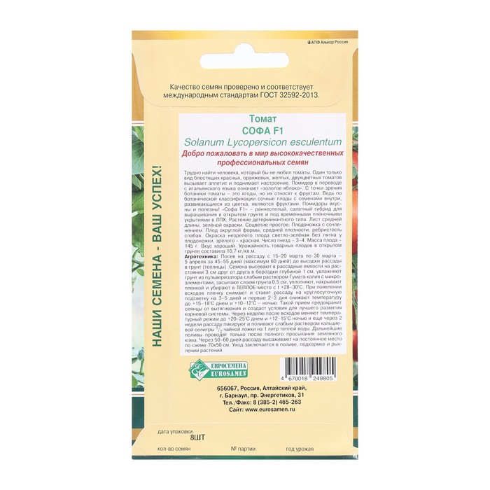 Раннеспелый детерминантный гибрид томата. С момента всходов до созревания первых плодов проходит 90-95 дней. Кисти простые, в каждой по 6-8 однородных плодов. Первое соцветие закладывается над 6 листом, последующие — через 1-2 листа. Томат отличается быстрой отдачей урожая и отличной завязываемостью. Плоды превосходных визуальных и вкусовых качеств — округлой формы, насыщенно-красного цвета, без зеленого пятна у плодоножки, массой 130-150 г. Томаты характеризуются отличной лежкостью, транспортабельностью, кислота в плодах практически отсутствует. Гибрид отлично подойдет для производства ранней продукции в открытом грунте и под временными укрытиями. Благодаря слабой облиственности, растения слабо подвержены заболеваниям. Гибрид устойчив к вирусу мозаики томата (ToMV), альтернариозу (Asc), фузариозу (Fol); толерантен к фитофторозу (Pi). Рекомендуемая плотность посадки — 4-5 растений/м² при формировании в 3 стебля. Урожайность в открытом грунте — до 20,0 кг/м², в защищенном — до 25,0 кг/м².