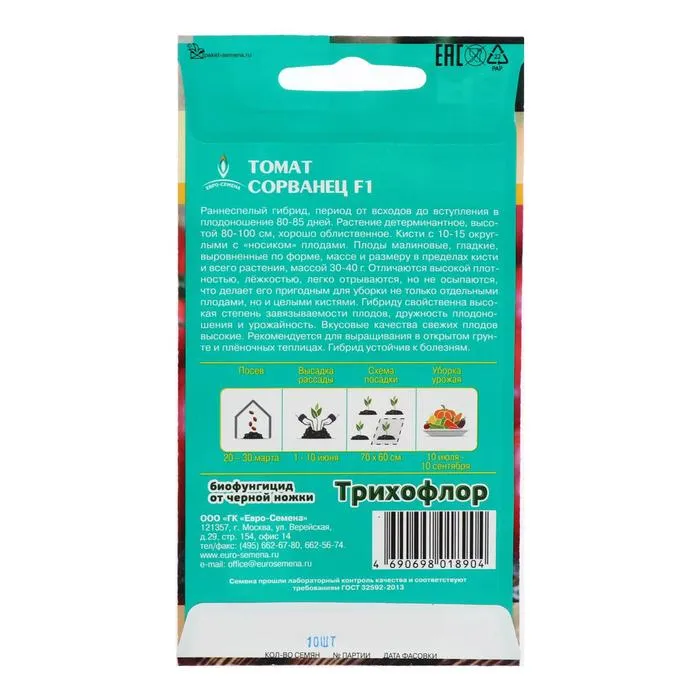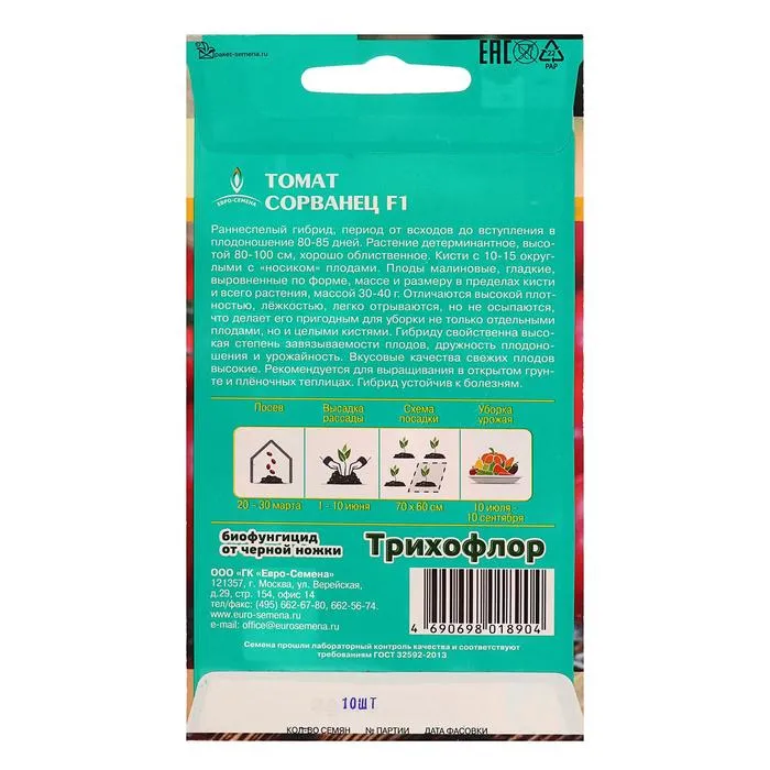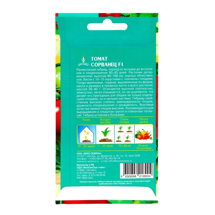 Раннеспелый гибрид, период от всходов до вступления в плодоношение 80-85 дней. Растение детерминантное, высотой 80-100 см, хорошо облиственное. Кисти с 10-15 округлыми с «носиком» плодами. Плоды малиновые, гладкие, выровненные по форме, массе и размеру в пределах кисти и всего растения, массой 30-40 г. Отличаются высокой плотностью, лёжкостью, легко отрываются, но не осыпаются, что делает его пригодным для уборки не только отдельными плодами, но и целыми кистями. Гибриду свойственна высокая степень завязываемости плодов, дружность плодоношения и урожайность. Вкусовые качества свежих плодов высокие. Рекомендуется для выращивания в открытом грунте и плёночных теплицах. Гибрид устойчив к болезням.