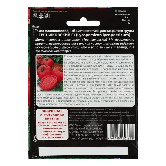 Семена Томат "Третьяковский" F1 среднеплодный, среднеранний,высокорослый, 10 шт — Характеристики