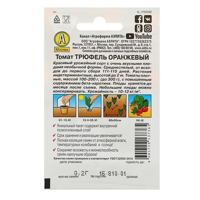 Семена Томат "Трюфель", оранжевый, индетерминантный,высокорослый, 0,2 г — Характеристики