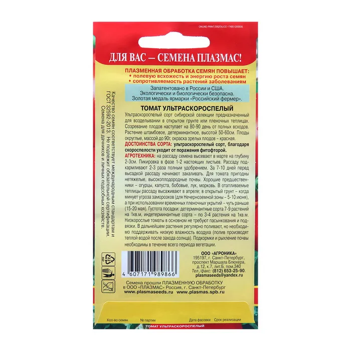 Посев: На рассаду семена высевают в марте на глубину 2-3 см. Пикировка – в фазе 1-2 настоящих листьев. Рассаду подкармливают 2-3 раза полным удобрением. За 7-10 дней перед высадкой рассаду начинают закалять. Для томата пригодны нетяжелые, высокоплодородные почвы. Хорошие предшественники – огурцы, капуста, бобовые, лук, морковь. В отапливаемые теплицы рассаду высаживают в апреле; в открытый грунт – когда минует угроза заморозков (для Нечерноземной зоны – 5-10 июня), а при использовании временных пленочных укрытий – чуть раньше (15-20 мая). Густота посадки: детерминантные сорта 7-9 растений на 1м², индетерминантные сорта – по 3-4 растения на 1м². Низкорослые томаты в основном не требуют пасынкования и подвязки.