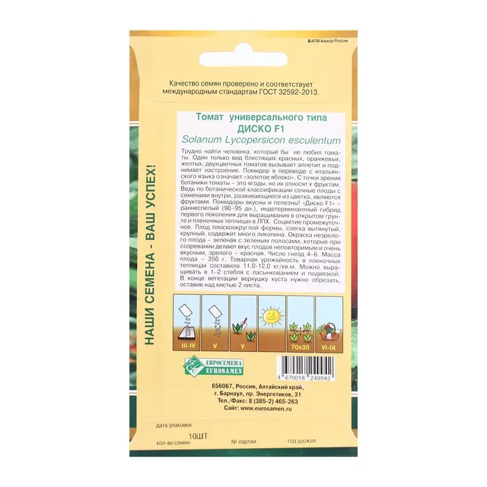 «Диско F1» -раннеспелый (90-95 дн.) , индетерминантный гибрид первого поколения для выращивания в открытом грунте и пленочных теплицах в ЛПХ.