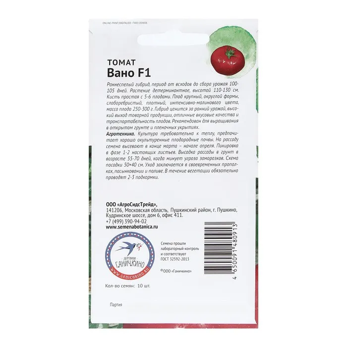 Ранний гибрид с крупными красивыми малиновыми плодами отличных вкусовых и товарных качеств. Период от всходов до созревания 100-105 дней. Растение среднеоблиственное, детерминантного типа, вы сотой 110-130 см. Первая кисть закладывается рано, над 5-6 листом, последующие через 1-2 листа. В кисти 5-6 округлых тяжеловесных плодов массой 250-300 грамм интенсивно - малиновой окраски.Томаты вкусные, плотные, но не жесткие, с хорошей транспортабельностью и способностью к дозариванию без потери товарных качеств. Выход стандартных плодов 99 %, урожайность за первых 2 сбора 8,7 кг/кВ.м, потенциальная урожайность до 20 кг/кВ.м. Гибрид устойчив к альтернаирозу и вирусу табачной мозаики. Рекомендуется для выращивания в открытом и защищенном грунте. Посев на рассаду производят за 50-60 дней до высадки растений на постоянное место. Оптимальная постоянная температура прорастания семян 23-25 град.При высадке в грунт на 1 кв. м. размещают 3 растения. Гибрид отзывчив на внесение удобрений и технологию возделывания. Выращивается в 1-2 стебля с подвязкой и пасынкованием.