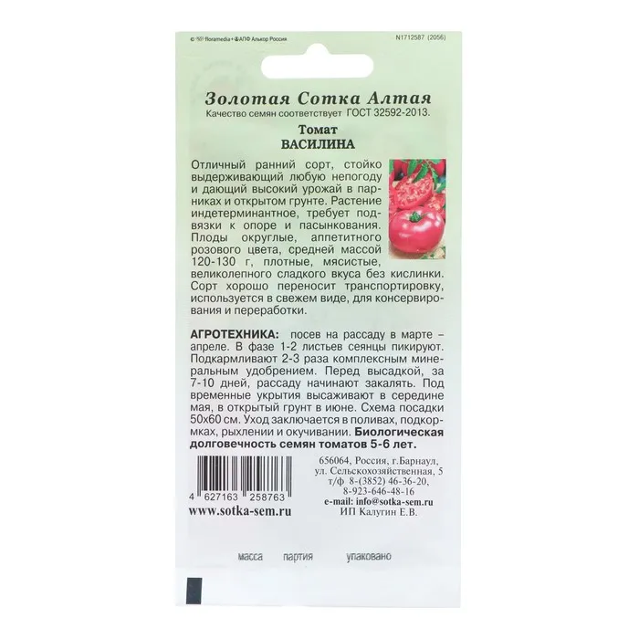Семена Томат "Василина " среднеранний, 0,1 г — Характеристики
