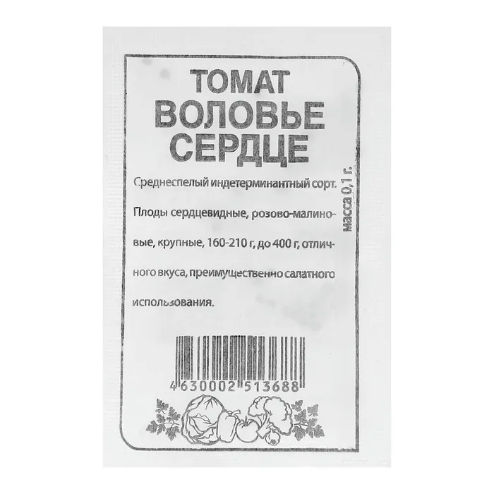 Среднеспелый (115-120 дней) индетерминантный сорт для выращивания в открытом грунте и теплицах. Плоды сердцевидные, розово-малиновые, крупные, 160-210 г, до 400 г, отличного вкуса, преимущественно салатного использования. В марте семена высевают на слегка утрамбованный грунт, мульчируют торфом или почвенным слоем 1 см, поливают теплой водой через ситечко, накрывают пленкой и ставят в теплое (около 25°С) место. После появления всходов пленку снимают, рассаду размещают в светлом месте. В течение 5-7 суток температуру поддерживают на уровне 15-16°С, затем повышают до 20-22°С. В фазе 1-2 настоящих листьев рассаду пикируют. 60-65-дневную рассаду в фазе 6-7 настоящих листьев и хотя бы одной цветочной кисти высаживают в защищенный или открытый грунт с соблюдением посадочного расстояния 40х40 см. Индетерминантные томаты формируют в 1, реже в 2 стебля, удаляя пасынки. При достижении растениями верха теплицы основной стебель прищипывается. Томаты хорошо отзываются на редкий, но обильный полив. При выращивании в теплице рекомендованы магниевые подкормки по вегетации. В период налива плодов рекомендуется произвести калийную подкормку. Урожай собирают в течение сезона по мере созревания. Недозревшие плоды могут дозариваться не на растении.
