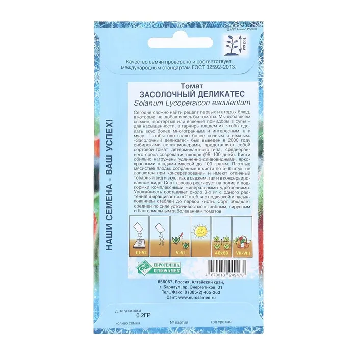 Высокоурожайный среднеспелый сорт, предназначенный для засолки и консервирования. Растение высотой до 1 м, выращивается в открытом грунте и пленочных укрытиях. Кисти обильно нагружены удлиненно-сливовидными ярко-красными плодами массой до 100 грамм. Плотные мясистые плоды не лопаются при консервировании и имеют отличный товарный вид и вкус как в свежем, так и в консервированном виде.