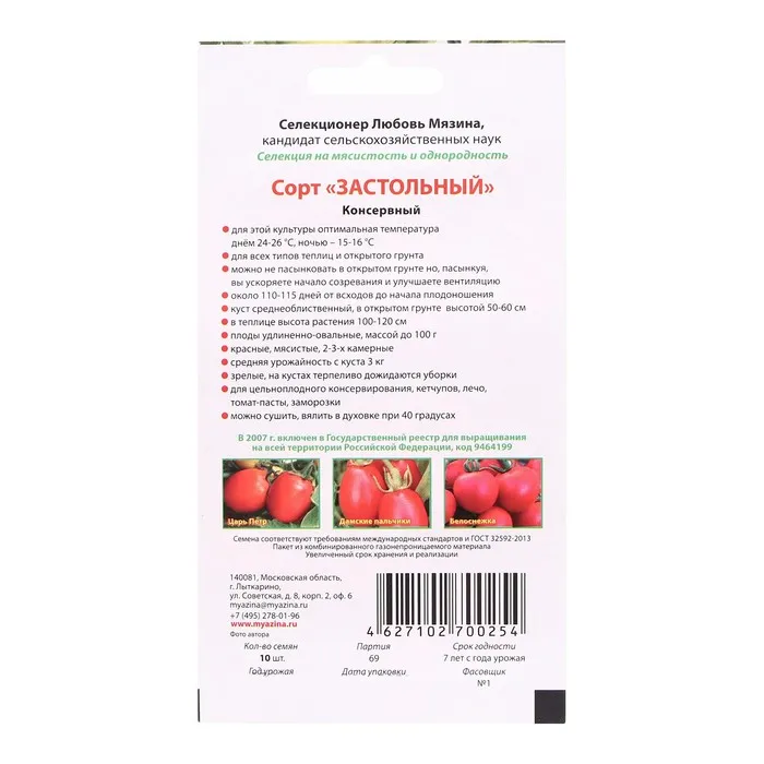 Маленький, но очень важный помидорчик – ни одно застолье без него не состоится. Аппетитные ярко-красные «сливки» плотные, мясистые, с тонкой нежной кожицей всегда в центре внимания любого стола. Сорт среднеранний (110-115 дней от всходов до созревания), легко адаптируется к погодным условиям. Прекрасно растёт в открытом грунте без пасынкования, достигая высоты до 50-60 см, под временными плёночными укрытиями несколько выше. Плоды сливовидные, весом от 60 до 90 г, при выращивании без полива мельчают до 40-60 г, но становятся более сладкими. На кусте висят долго, не растрескиваются.
