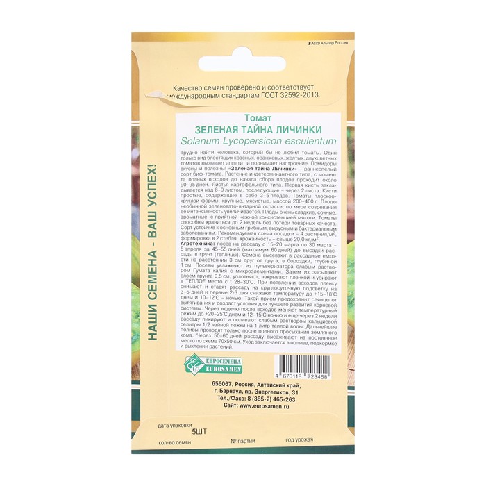 Сорт раннеспелый. От всходов до первого сбора плодов 90-95 дней. Растение компактное, с картофельным типом листа для открытого и защищенного грунта. Рекомендуется формировать в 2-3 стебля. Высота растений в теплицах 1,8-2,0 метра, в открытом грунте 1,0-1,3 метра. Плоды крупные, массой 200-250 граммов, плоскоокруглые, зелёные, в полной спелости с оливковым оттенком. В кисти в среднем 4-7 плодов. Отличается высокой устойчивостью к заболеваниям. Уникальные вкусовые качества даже в плодах первого сбора. Используется для потребления в свежем виде. Плотность посадки 3-4 растения на м2. Урожайность 12-16 кг/м2.