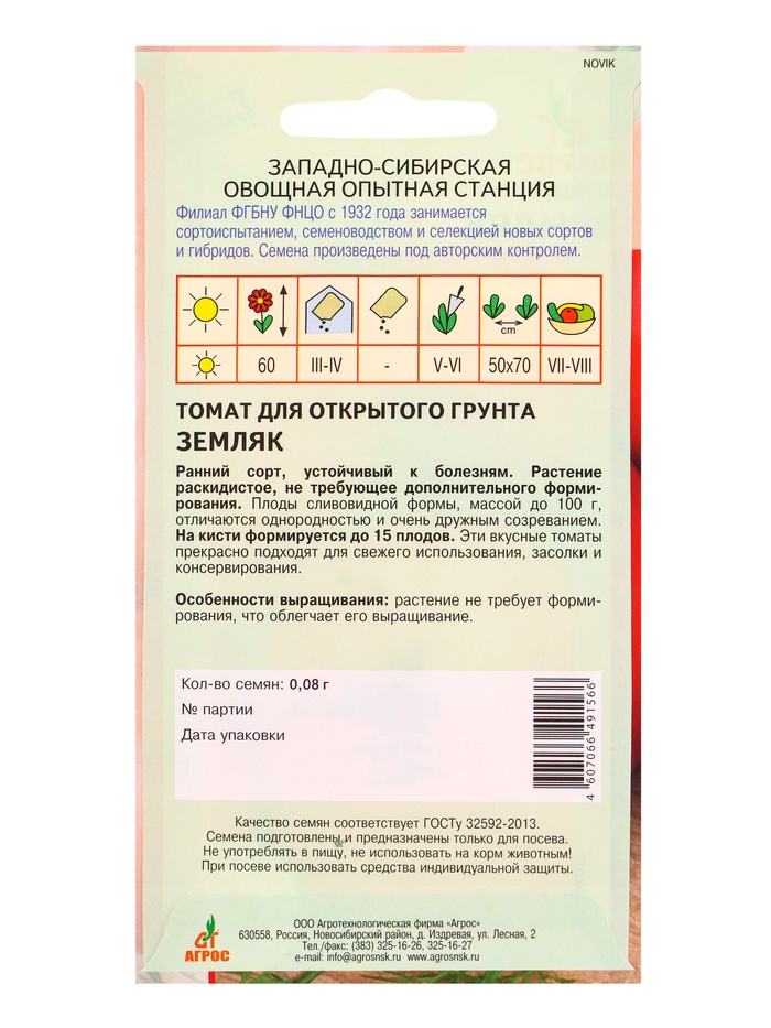 Семена Томат «Земляк», 0.08 г, «Агросс» — Характеристики