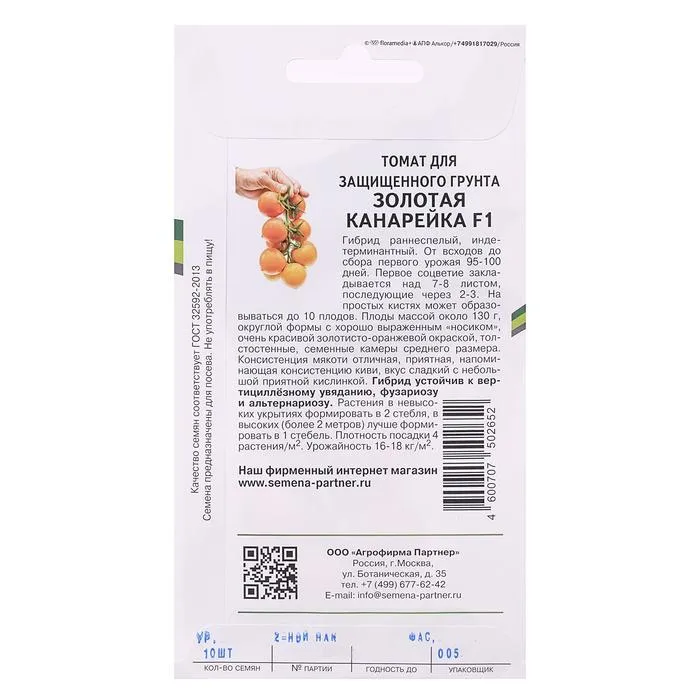 Гибрид раннеспелый, индетерминантный. От всходов до сбора первого урожая 95-100 дней. Первое соцветие закладывается над 7-8 листом, последующие через 2-3. На простых кистях может образовываться до 10 плодов. Плоды массой около 130 г, округлой формы с хорошо выраженным "носиком", очень красивой золотисто-оранжевой окраской, толстостенные, семенные камеры среднего размера. Консистенция мякоти отличная, приятная, напоминающая консистенцию киви, вкус сладкий с небольшой приятной кислинкой. Гибрид устойчив к вертициллёзному увяданию, фузариозу и альтернариозу. Растения в невысоких укрытиях формировать в 2 стебля, в высоких (более 2 метров) лучше формировать в 1 стебель.