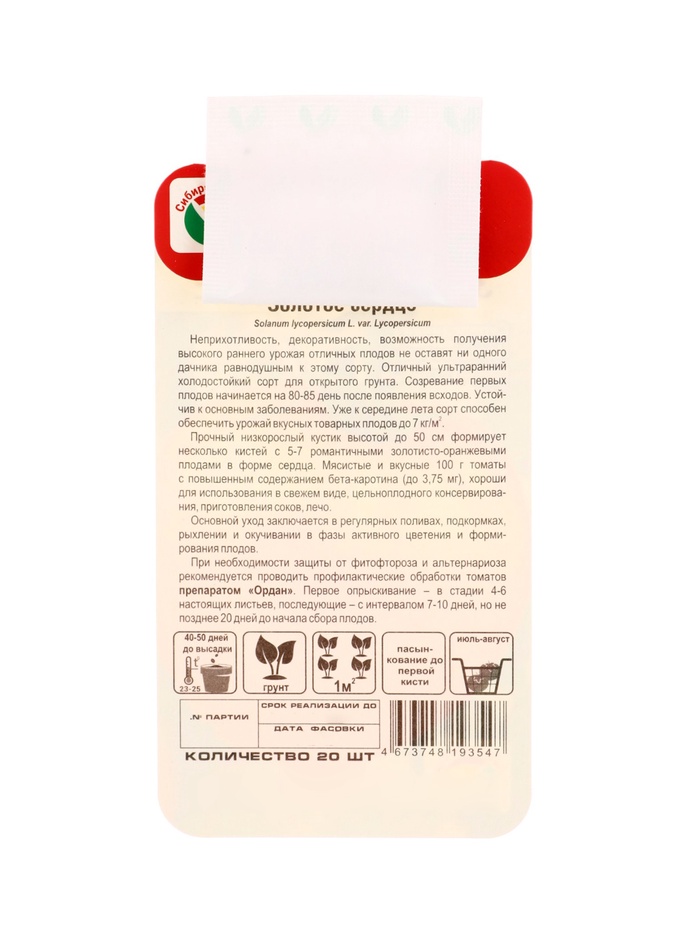 Семена Томат «Золотое сердце», 20 шт., «Сибирский сад» — Характеристики