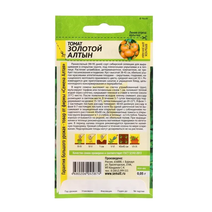 Раннеспелый (90-95 дней) сорт сибирской селекции для выращивания в открытом грунте, под пленочными укрытиями и в теплице. Растение штамбовое, детерминантное, компактное, не требует пасынкования подвязки. Куст высотой 38-45 см, обильно усыпан красивыми аппетитными плодами – округлыми, гладкими, насыщенного желтовато-оранжевого цвета, средней массой 50 гр. Рекомендуется для приготовления салатов и украшения блюд, цельноплодного консервирования и переработки. В марте семена высевают на слегка утрамбованный грунт, мульчируют торфом или почвенным слоем 1 см, поливают теплой водой через ситечко, накрывают пленкой и ставят в теплое (около 25°С) место. После появления всходов пленку снимают, рассаду размещают в светлом месте. В течение 5-7 суток температуру поддерживают на уровне 15-16°С, затем повышают до 20-22°С. В фазе 1-2 настоящих листьев рассаду пикируют. 60-65-дневную рассаду в фазе 6-7 настоящих листьев и хотя бы одной цветочной кисти высаживают в защищенный или открытый грунт с соблюдением посадочного расстояния 40х40 см. Детерминантные томаты в открытом грунте формируют в 1-2 стебля, в теплице – в 3-4 стебля. Томаты хорошо отзываются на редкий, но обильный полив. При выращивании в теплице рекомендованы магниевые подкормки по вегетации. В период налива плодов рекомендуется произвести калийную подкормку. Урожай собирают в течение сезона по мере созревания. Недозревшие плоды могут дозариваться не на растении.