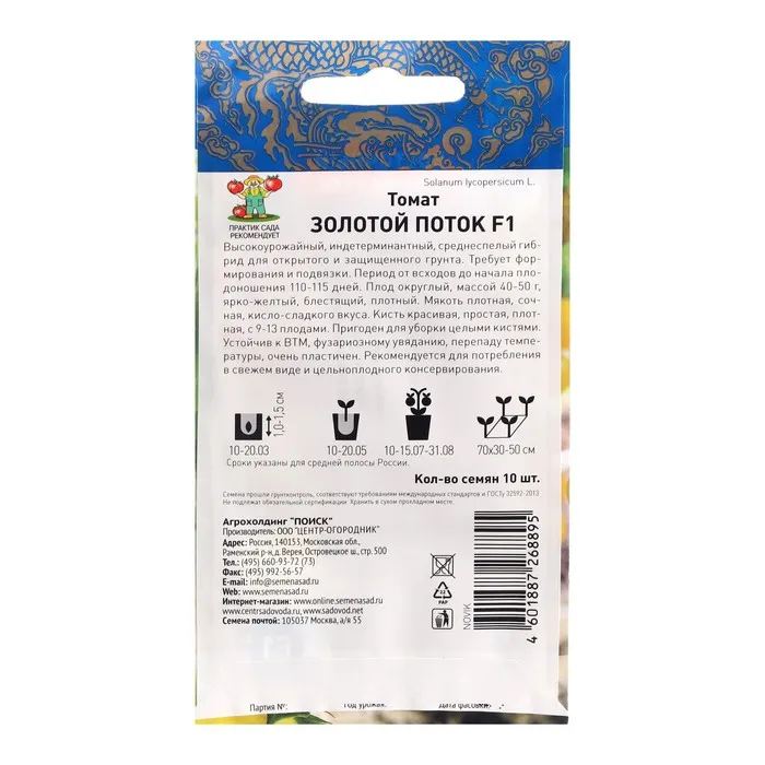 Высокоурожайный, индетерминантный, среднеспелый гибрид для защищенного грунта. Требует формирования и подвязки. Период от всходов до начала плодоношения 110-112 дней. Плод округлый, массой 40-50 г, ярко-желтый, блестящий, плотный. Мякоть плотная, сочная, кисло-сладкого вкуса. Кисть красивая, простая, плотная, с 9-13 плодами. Пригоден для уборки целыми кистями. Устойчив к ВТМ, фузариозному увяданию, очень пластичен, устойчив к перепаду температуры. Рекомендуется для потребления в свежем виде и цельноплодного консервирования.