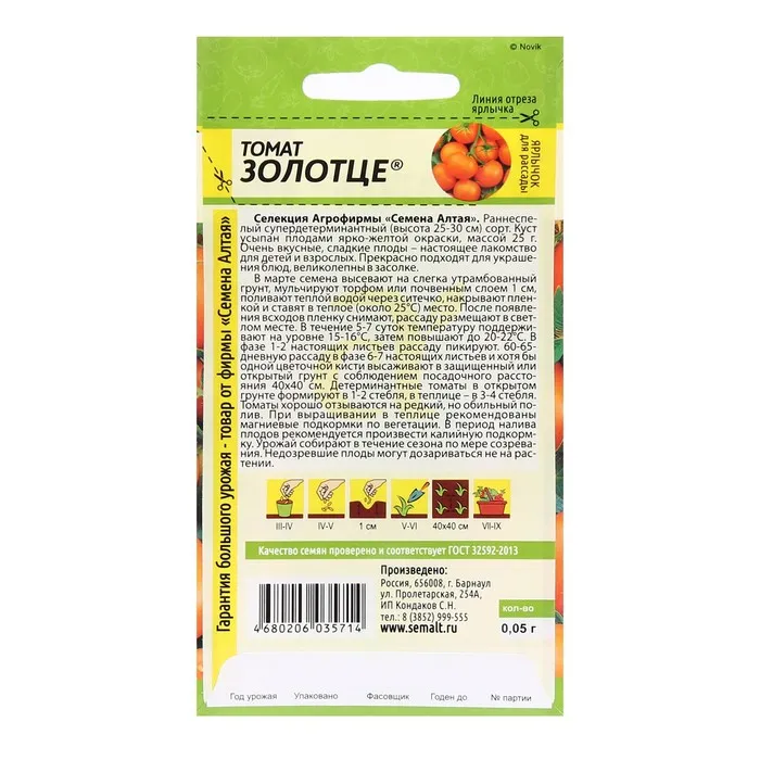Селекция Агрофирмы «Семена Алтая». Раннеспелый супердетерминантный (высота 25-30 см) сорт. Куст усыпан плодами ярко-желтой окраски, массой 25 г. Очень вкусные, сладкие плоды — настоящее лакомство для детей и взрослых. Прекрасно подходят для украшения блюд, великолепны в засолке.