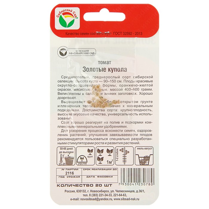 Растение детерминантное, высотой до 90 см в открытом грунте, в закрытом иногда вырастает и до 1,5 метров. Побегообразовательная способность и облиственность умеренные, благодаря чему кустик не слишком загущенный и имеет возможность поглощать больше света. Листья томата среднего размера, тёмно-зелёные, обычного типа, со слабоморщинистой поверхностью. Соцветие простое. Первая плодовая кисть закладывается над 8 листом, следующие образуются через 1 — 2 листа. В каждой кисти около 5 завязей. Плодоножка с сочленением. Плоды у Золотых куполов очень крупные, не слишком плотные, толстостенные, форма может быть или плоскоокруглой, со слабой ребристостью у плодоножки, или сердцевидной.