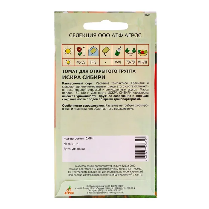 Посев семян на рассаду рекомендуется проводить в марте-апреле. Уже в апреле можно пересаживать растения в открытый грунт, где они продолжат свой рост и развитие. Сорт "Искра Сибири" характеризуется устойчивостью к неблагоприятным условиям, а агрономический срок годности семян составляет 4 года, что позволяет планировать посадки на несколько сезонов вперед.