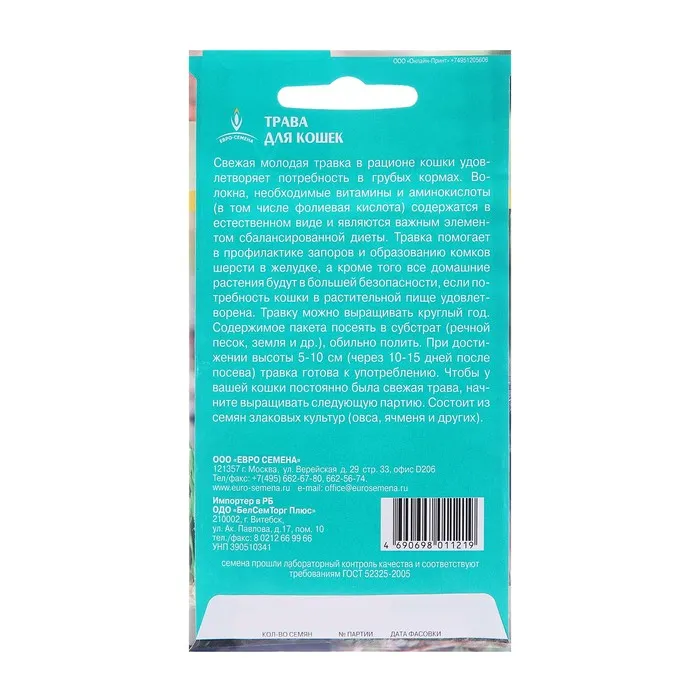 Семена травы для кошек - это набор семян, которые позволяют вырастить специальную траву, которая предназначена для потребления кошками. Эта трава является идеальным дополнением к рациону вашего питомца и помогает улучшить его пищеварение.Каждый пакет содержит 10 грамм семян, которые гарантированно приведут к выращиванию здоровой и крепкой травы. Семена травы для кошек идеально подходят для выращивания как в домашних условиях, так и на открытом воздухе.Эта трава не только содержит важные витамины и минералы, но также помогает кошкам очищать желудочно-кишечный тракт от шерсти, которую они проглатывают во время груминга. Кроме того, трава для кошек может помочь уменьшить стресс и тревожность у вашего питомца.Выращивание травы для кошек - это простой и увлекательный процесс, который позволяет получить свежую и полезную траву для вашего питомца.
