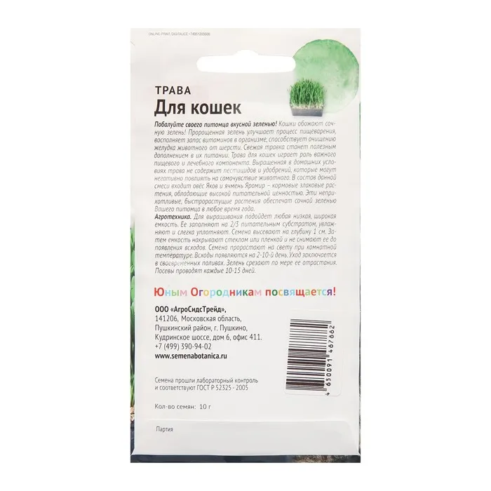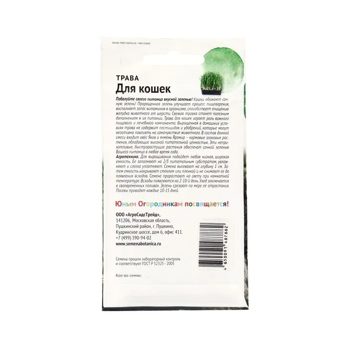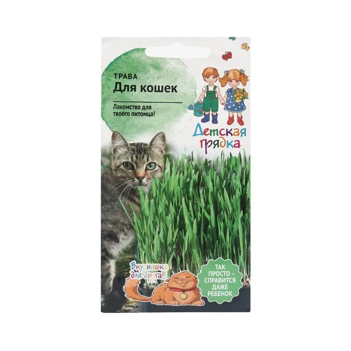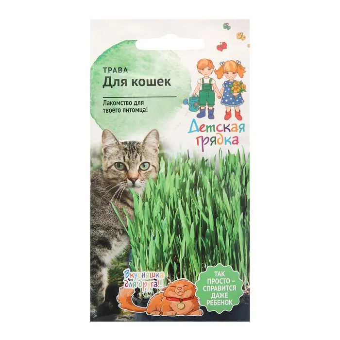 Побалуйте своего питомца вкусной зеленью. Кошки обожают сочную зелень. Пророщенная зелень улучшает процесс пищеварения, восполняет запас витаминов в организме, способствует очищению желудка животного от шерсти. Свежая травка станет полезным дополнением в их питании. Трава для кошек играет роль важного пищевого и лечебного компонента. Выращенная в домашних условиях трава не содержит пестицидов и удобрений, которые могут негативно повлиять на самочувствие животного. В состав данной смеси входит Овёс «Яков» и ячмень «Яромир»- кормовые злаковые растения, обладающее высокой питательной ценностью. Эти неприхотливые, быстрорастущие растения обеспечат сочной зеленью Вашего питомца в любое время года.
