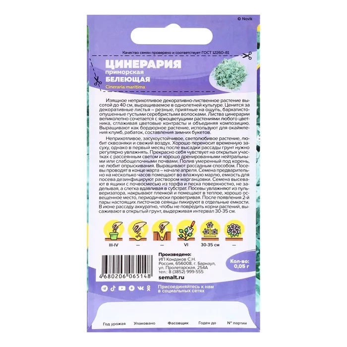 Замечательное изящное почвопокровное растение высотой до 40 см., выращиваемое в однолетней культуре. Ценится за декоративные листья – резные, приятные на ощупь, бархатисто-опушенные густыми серебристыми волосками. Листва цинерарии великолепно сочетается с ярко цветущими растениями любого цветника, сглаживая цветовые контрасты и объединяя композицию. Выращивают как ковровое, бордюрное растение, используют для окаймления клумб, рабаток, составления зимних букетов. Неприхотлива, засухоустойчива, светолюбива. Прекрасно себя чувствует на участках с рассеянным светом и хорошо дренированными нейтральными или слабощелочными почвами. Полив необходим регулярный, но умеренный. Размножают рассадным способом. Семена высевают в ящики в апреле и слегка присыпают землей, посевы увлажняют и накрывают пленкой. После появления 2 пары листочков сеянцы пикируют в отдельные емкости. В июне рассаду высаживают в открытый грунт, выдерживая расстояния 35-45 см.