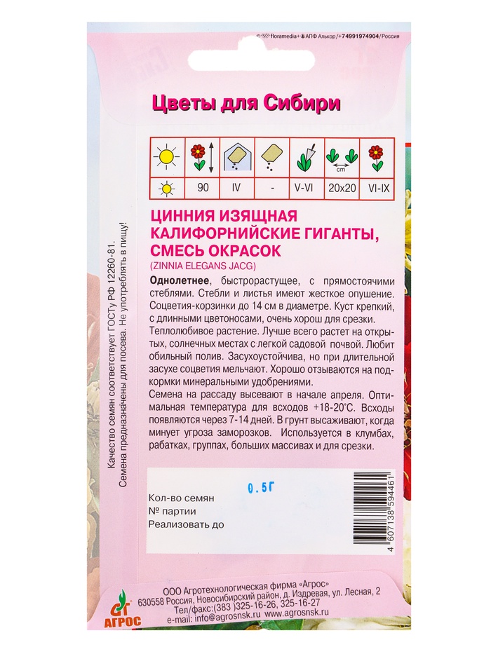 Семена Цинния Изящная "Калифорнийские гиганты" 0,5 г — Характеристики