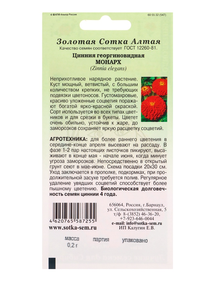 Семена Цинния «Монарх», 0.2 г, красная, «Золотая Сотка Алтая» — Характеристики