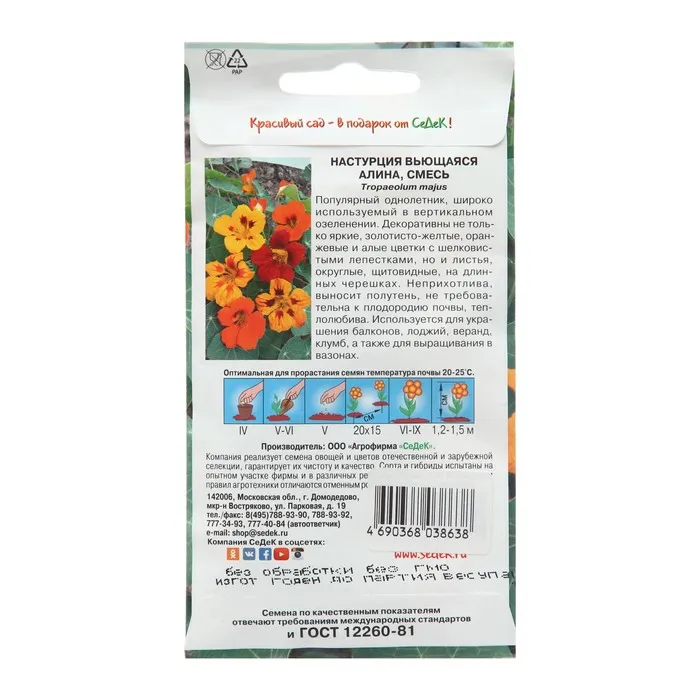 Настурция - семена однолетнего, вьющегося растения. Красивое, декоративное растение с яркими цветками. Цветки с бархатными лепестками, крупного размера, воронкоподобной формы, разнообразных оттенков: желтые, оранжевые, красные. Настурция неприхотлива в выращивании. Листья широкие, округлой формы. Используется для вертикального озеленения беседок, лоджий, балконов. Выращивают в клумбах, вазонах, контейнерах и т.д.