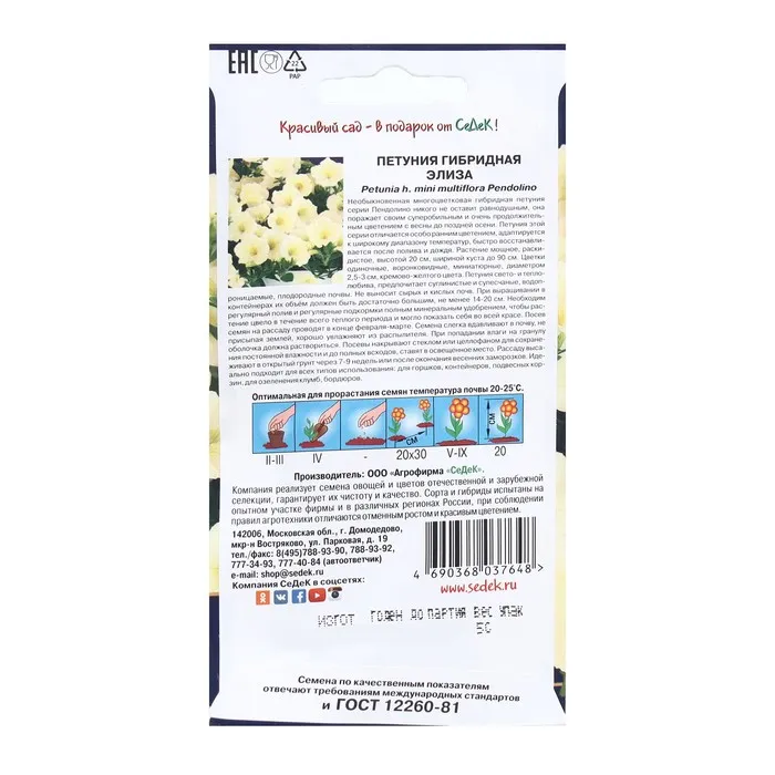 Посев семян на рассаду проводят в конце февраля-марте. Семена слегка вдавливают в почву, не присыпая землей, хорошо увлажняют из распылителя. При попадании влаги на гранулу оболочка должна раствориться. Посевы накрывают стеклом или целлофаном для сохранения постоянной влажности и до полных всходов, ставят в освещенное место. Рассаду высаживают в открытый грунт через 7-9 недель или после окончания весенних заморозков. Идеально подходит для всех типов использования: для горшков, контейнеров, подвесных корзин, для озеленения клумб, бордюров.