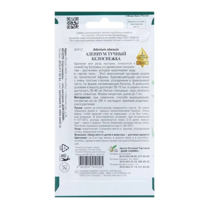 Семена цветов Адениум тучный "Белоснежка", 3 шт — Характеристики