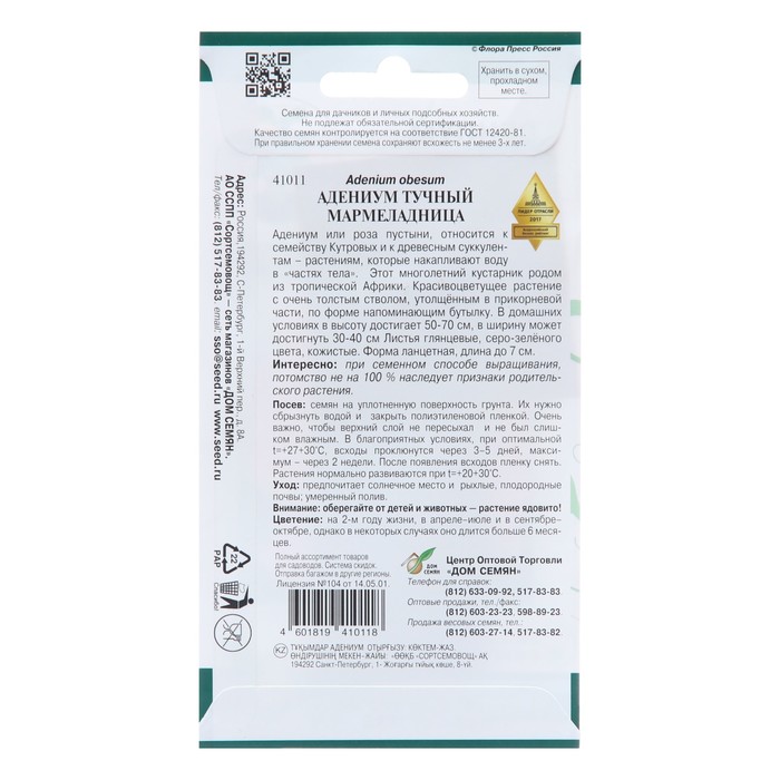 Семена цветов Адениум тучный «Мармеладница», 3 шт., «Дом семян» — Характеристики