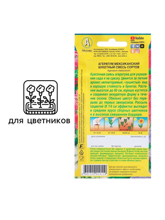 Агератум «Букетный» отличается обильным цветением даже при неблагоприятных погодных условиях. Растения теплолюбивые, предпочитают солнечные места, не переносят сырую почву, хорошо отрастают после стрижки. Подходят на срезку. Для составления эффектного букета достаточно 3 растений. Агератум рекомендуется для цветников всех типов.