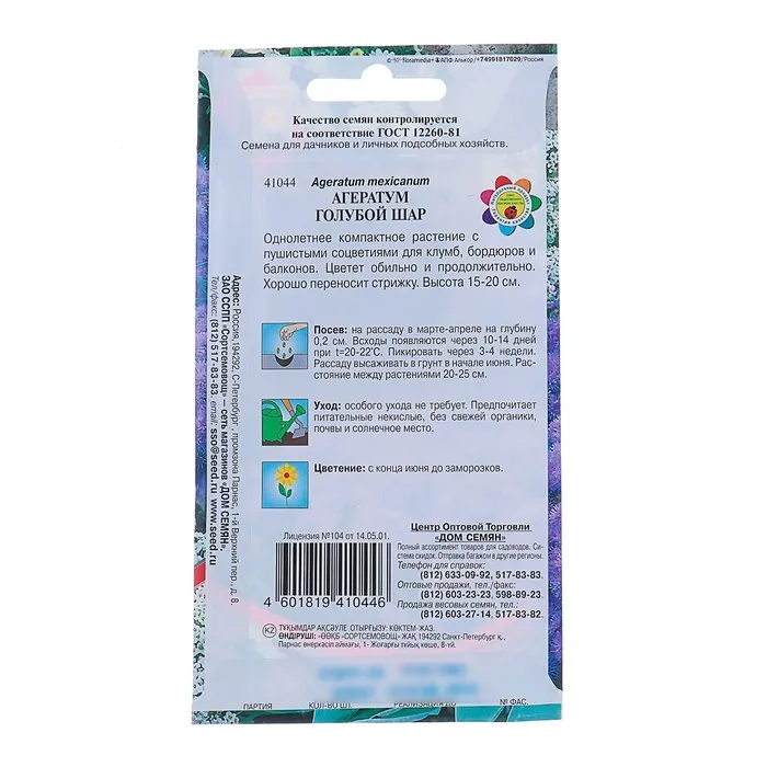 Семена цветов Агератум "Голубой шар" Дом семян, О, 200 шт — Характеристики