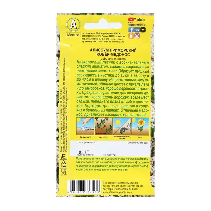 Семена Цветов Алиссум "Ковер-медонос", 0,05 г — Характеристики