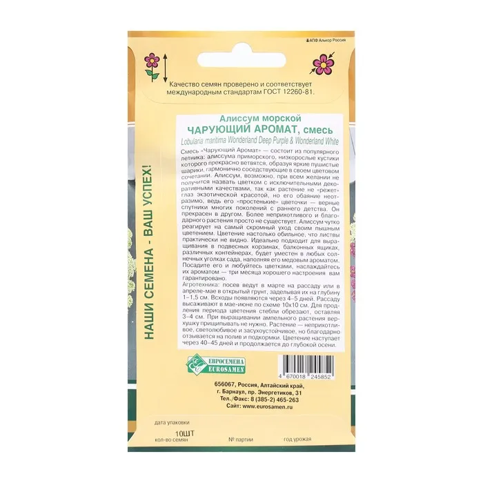 Смесь «Чарующий Аромат» - состоит из популярного летника: алиссума приморского, низкорослые кустики которого прекрасно ветвятся, образуя яркие пушистые шарики, гармонично соседствующие в своем цветовом сочетании.