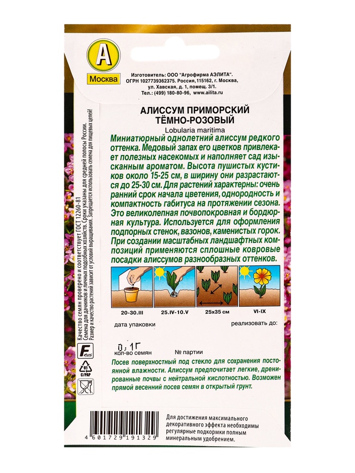 Семена цветов Алиссум приморский Тёмно-розовый Золотая серия, Ц/П,0,1 г — Характеристики