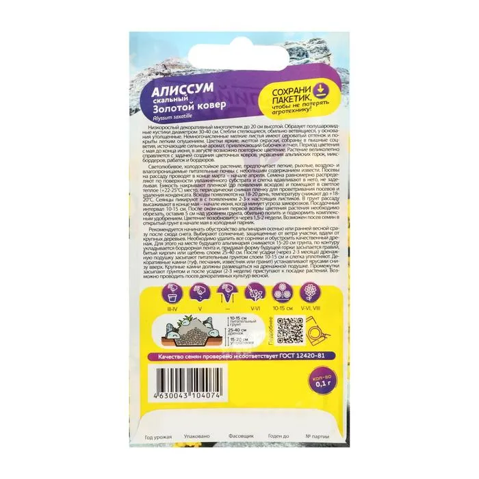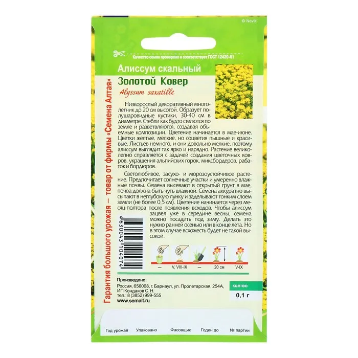 Алиссум - морозоустойчивый многолетник, предпочитающий хорошо освещенные участки с рыхлым, легким и питательным грунтом. Семена высеиваются на рассаду со второй половины марта до середины апреля: Семена алиссума равномерно выкладываются на увлажненную почву и слегка вдавливаются, без заделки в грунт. Рассадную емкость прикрывают стеклом или полиэтиленом и оставляют в хорошо освещенном месте при температуре +22-25°С. Первые ростки появляются спустя 17-20 дней, после чего температуру нужно понизить до +17-20°С. После появления первой пары настоящих листочков рассаду пикируют в отдельные емкости. В конце мая или первой половине июня, когда исчезнет риск возвратных заморозков, алиссум пересаживается на постоянное место. В июне начинается первая волна цветения Золотого Ковра. После ее завершения кустики нужно обрезать, оставив не больше 5 см в высоту, полить и внести комплексное минеральное удобрение. При соблюдении агротехники через 10-15 дней алиссум порадует повторным цветением.