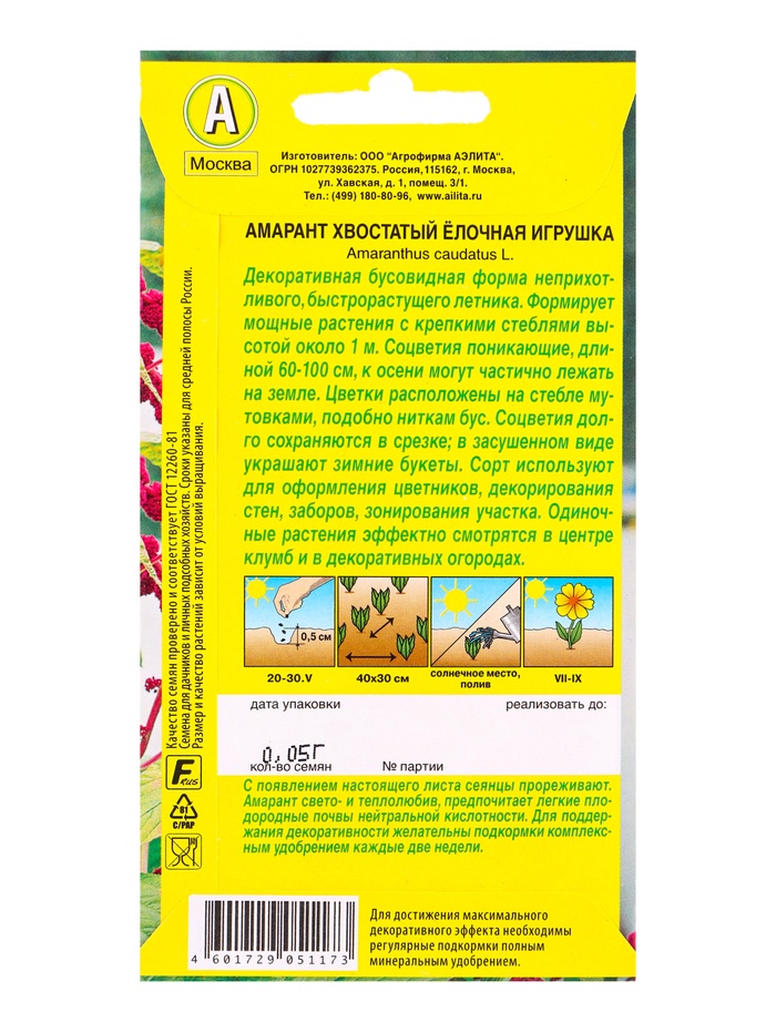Семена цветов Амарант Елочная игрушка , Ц/П,0,05 г — Характеристики