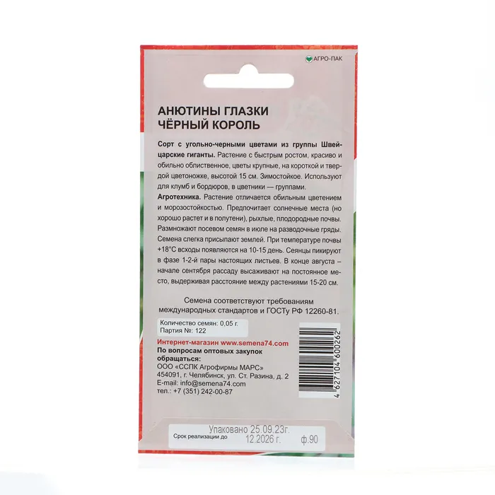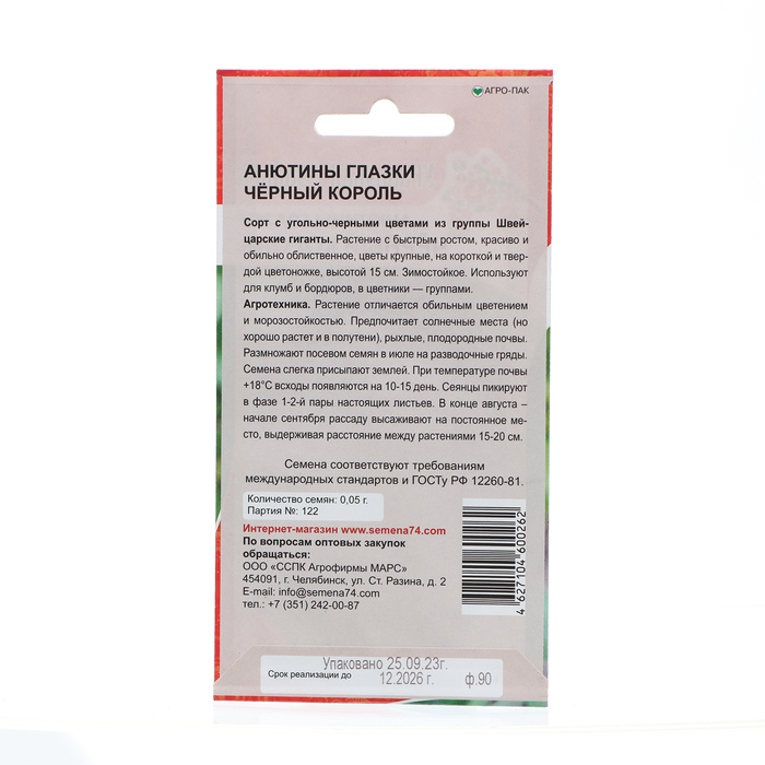 Семена Цветов Анютины глазки "Чёрный король" , 0 ,05 г — Характеристики