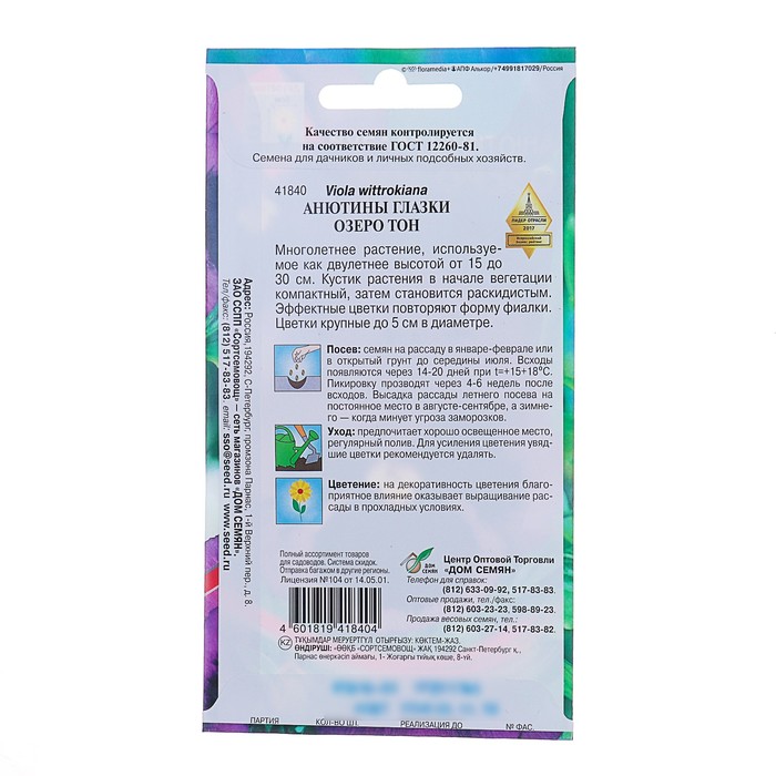 Семена цветов Анютины глазки "Озеро Тон", Дв, 40 шт. — Характеристики