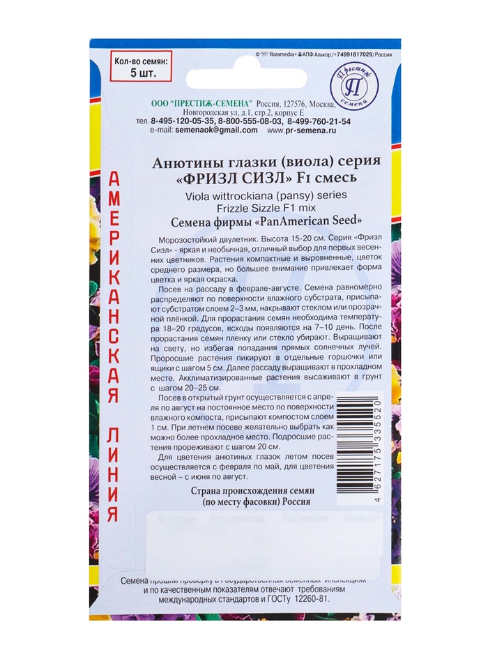 Семена цветов Анютины глазки витторка "Фризл Сизл", Смесь, 5 шт — Характеристики