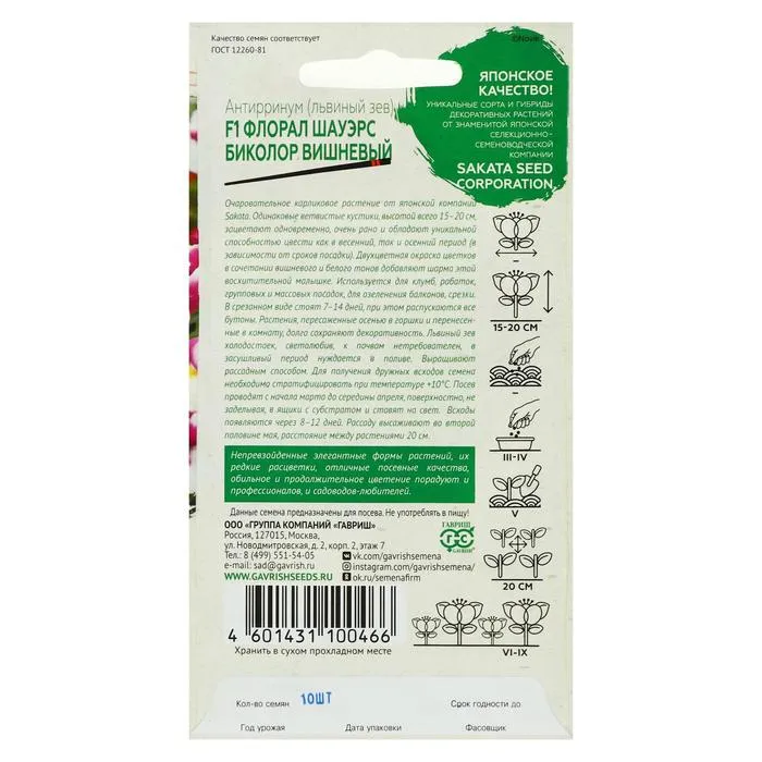 Очаровательное карликовое растение от японской компании Sakata. Одинаковые ветвистые кустики, высотой всего 15-20 см, зацветают одновременно, очень рано и обладают уникальной способностью цвести как в весенний, так и осенний период (в зависимости от сроков посадки). Двухцветная окраска цветков в сочетании вишневого и белого тонов добавляют шарма этой восхитительной малышке. Используется для клумб, рабаток, групповых и массовых посадок, для озеленения балконов, срезки. В срезанном виде стоят 7-14 дней, при этом распускаются все бутоны. Растения, пересаженные осенью в горшки и перенесенные в комнату, долго сохраняют декоративность. Львиный зев холодостоек, светолюбив, к почвам нетребователен, в засушливый период нуждается в поливе. Выращивают рассадным способом. Для получения дружных всходов семена необходимо стратифицировать при температуре +10°С. Посев проводят с начала марта до середины апреля, поверхностно, не заделывая, в ящики с субстратом и ставят на свет. Всходы появляются через 8-12 дней. Рассаду высаживают во второй половине мая, расстояние между растениями 20 см.