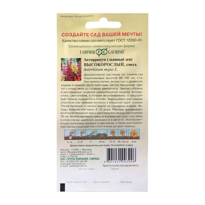 Декоративное растение из семейства Норичниковые, культивируемое как однолетник, высотой 80-100 см. Цветет с конца июня до поздних заморозков Цветки собраны в кистевидные соцветия разнообразной окраски. Холодостоек, светолюбив, к почвам нетребователен, в засушливый период нуждается в поливе. Выращивают рассадным способом. Посев проводят с начала марта до середины апреля. Всходы появляются через 8-12 дней. Рассаду высаживают во второй половине мая с расстоянием между растениями 30 см. Используется для групповых посадок и цветников, а также для получения срезки (львиный зев стоит в воде до двух недель).
