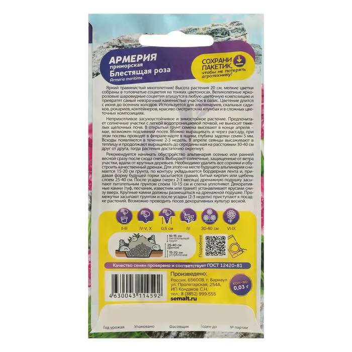 Яркий травянистый многолетник! Высота растения 20 см, мелкие цветки собраны в головчатые соцветия на тонких цветоносах. Великолепные ярко-розовые шаровидные соцветия впишутся в любую цветочную композицию и превратят самый невзрачный каменистый участок в оазис. Цветение длится с июня до осенних холодов. Используется для альпинариев, скальных садиков, рокариев, контейнеров, красиво смотрится на клумбах и в сложных цветочных композициях. Неприхотливое засухоустойчивое и зимостойкое растение. Предпочитает солнечные участки с легкой водопроницаемой почвой, не выносит тяжелых щелочных почв. В открытый грунт семена высевают в конце апреля - мае, возможен подзимний посев. Можно выращивать и через рассаду, при этом посевы проводят в феврале-марте в ящики, глубина заделки семян 5 мм. Всходы появляются в течение 2-3 недель. В апреле сеянцы высаживают в теплицу и продолжают выращивать до середины мая на расстоянии 30-40 см друг от друга, тогда растения достаточно окрепнут.