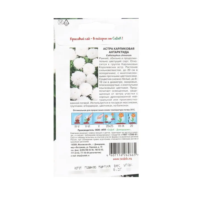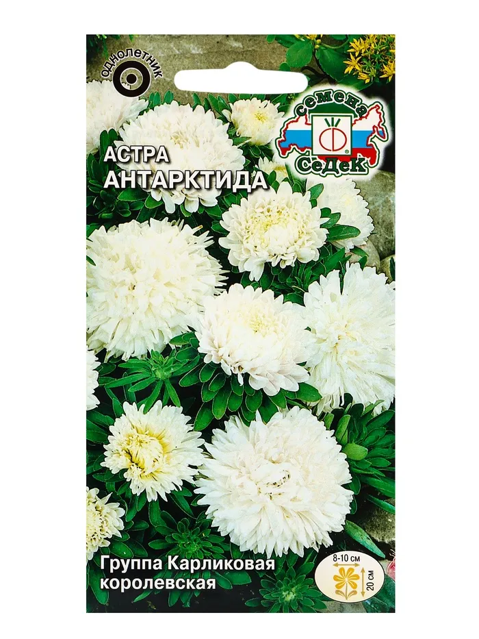 Растение плотное, прочное, широкопирамидальной формы, высотой 50-55 см, диаметром 25 см, сильноветвистое. Соцветия полумахровые, диаметром 5-6 см, белые с желтым диском. Количество их на растении достигает 80-100 шт. Для выращивания подходят хорошо освещенные участки с плодородной суглинистой или супесчаной почвой. Астры обладают высокой холодостойкостью – хорошо переносят заморозки до -3-4°C. Выращивают чаще всего рассадным способом. Семена высевают в марте-апреле, пикируют с развитием первой пары настоящих листочков по схеме 5х5 см, в открытый грунт рассаду высаживают с середины мая до начала июня. Возможен подзимний посев астр: в конце октября на глубину 5-8 см. Сверху посевы мульчируют торфом или опилками на высоту 3-5 см. Весной в конце марта -начале апреля посевы раскрывают. Появившиеся в конце апреля всходы будут закаленными, а выросшие растения сильными, устойчивыми к заморозкам и обильно цвести. Используются для получения срезки и оформления участка.