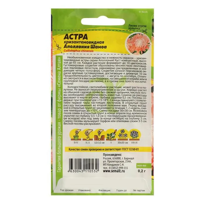 Необыкновенное изящество и нежность окрасок - хризантемовидные астры серии Аполлония! Куст компактный, высотой до 65 см. Каждое растение формирует до 10 цветоносов. Густомахровые соцветия образованы множеством лентовидных язычковых лепестков, равномерно распределенных и создающих четкую полусферу. Соцветия сочной персиковой окраски крупные густомахровые, достигающие в диаметре 10 см. Продолжительность цветения - с августа по сентябрь. Отлично смотрится в высоком бордюре, на смешанной клумбе или в групповой посадке на газоне, а в срезке она просто восхитительна! Холодостойкое, светолюбивое растение, может расти в полутени. Не выносит переувлажнения и засухи. Хорошо растет на обычной садовой почве без свежей органики, кислые почвы необходимо нейтрализовать известью. Семена на рассаду высевают в марте-апреле, глубина заделки 0,5 см. Посевы содержат при температуре +15-18°С. Сеянцы пикируют с появлением первой пары настоящих листочков. В открытый грунт рассаду высаживают во второй половине мая. Перед высадкой в открытый грунт её закаливают в течение 1-2 недель, снизив температуру до +10°С. Схема посадки 3030 см. Возможен посев семян в открытый грунт в конце апреля под временное укрытие на глубину 0,5-1,0 см (с последующим прореживанием всходов), или под зиму (в конце октября) на глубину 3 см. Сверху посевы мульчируют торфом или опилками слоем 3-5 см. Весной посевы раскрывают.