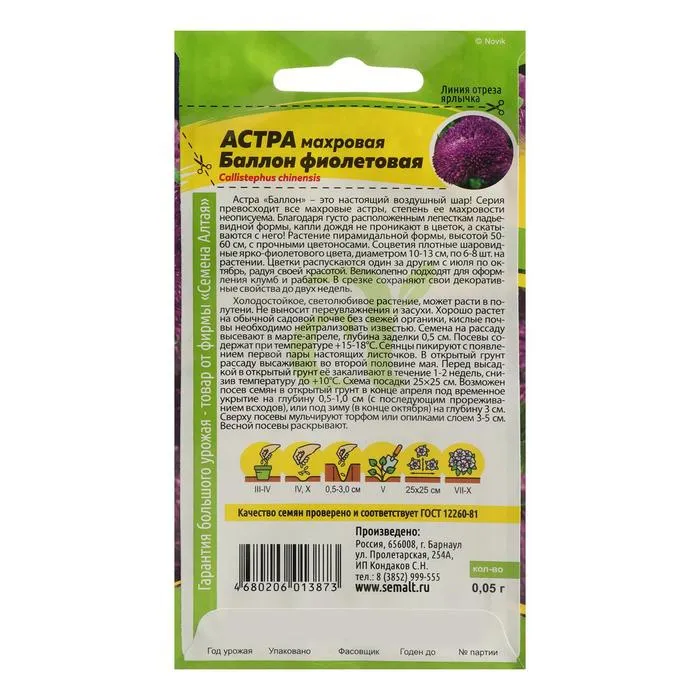 Астра «Баллон» - это настоящий воздушный шар! Серия превосходит все махровые астры,степень ее махровости неописуема. Благодаря густо расположенным лепесткам ладьевидной формы, капли дождя не проникают в цветок, а скатываются с него! Растение пирамидальной формы, высотой 50-60 см, с прочными цветоносами. Соцветия плотные шаровидные ярко-фиолетового цвета, диаметром 10-13 см, по 6-8 шт. на растении. Цветки распускаются один за другим с июля по октябрь, радуя своей красотой.Великолепно подходят для оформления клумб и рабаток. В срезке сохраняют свои декоративные свойства до двух недель. Холодостойкое, светолюбивое растение, может расти в полутени. Не выносит переувлажнения и засухи. Хорошо растет на обычной садовой почве без свежей органики, кислые почвы необходимо нейтрализовать известью. Семена на рассаду высевают в марте-апреле, глубина заделки 0,5 см. Посевы содержат при температуре +15-18°С. Сеянцы пикируют с появлением первой пары настоящих листочков. В открытый грунт рассаду высаживают во второй половине мая. Перед высадкой в открытый грунт её закаливают в течение 1-2 недель, снизив температуру до +10°С. Схема посадки 2525 см. Возможен посев семян в открытый грунт в конце апреля под временное укрытие на глубину 0,5-1,0 см (с последующим прореживанием всходов), или под зиму (в конце октября) на глубину 3 см. Сверху посевы мульчируют торфом или опилками слоем 3-5 см. Весной посевы раскрывают.