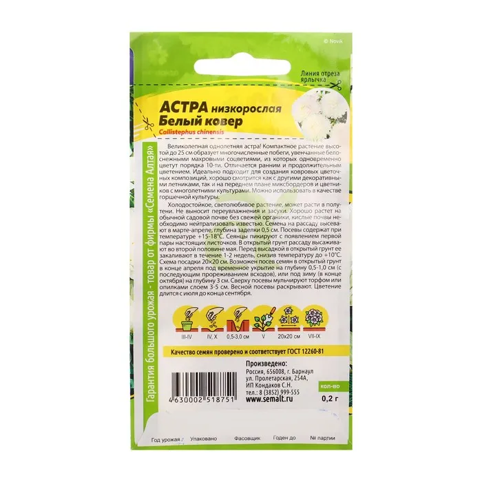 Великолепная однолетняя астра! Компактное растение высотой до 25 см образует многочисленные побеги, увенчанные белоснежными махровыми соцветиями, из которых одновременно цветут порядка 10-ти. Отличается ранним и продолжительным цветением, с конца июля до заморозков. Идеально подходит для создания ковровых цветочных композиций, хорошо смотрится как с другими декоративными летниками, так и на переднем плане миксбордеров и цветников с многолетними культурами. Можно использовать в качестве горшечной культуры. Холодостойкое, светолюбивое растение, может расти в полутени. Не выносит переувлажнения и засухи. Хорошо растет на обычной садовой почве без свежей органики, кислые почвы необходимо нейтрализовать известью. Семена на рассаду высевают в марте-апреле, глубина заделки 0,5 см. Посевы содержат при температуре +15-18°С. Сеянцы пикируют с появлением первой пары настоящих листочков. В открытый грунт рассаду высаживают во второй половине мая. Перед высадкой в открытый грунт её закаливают в течение 1-2 недель, снизив температуру до +10°С. Схема посадки 2020 см. Возможен посев семян в открытый грунт в конце апреля под временное укрытие на глубину 0,5-1,0 см (с последующим прореживанием всходов), или под зиму (в конце октября) на глубину 3 см. Сверху посевы мульчируют торфом или опилками слоем 3-5 см. Весной посевы раскрывают.