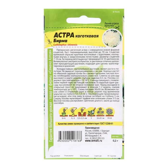 Прекрасная срезочная астра с совершенно новой формой соцветий. Куст пирамидальный, высотой до 70 см. Соцветия кремовой окраски крупные коготковые с короткими, изогнутыми внутрь и закрученными лепестками. Диаметр cоцветий 7-10 см. За период вегетации куст формирует 8-10 цветоносов. Великолепно смотрится в букетах, в цветниках отлично дополняет яркоцветущие растения, подходит для срезки, транспортировки и хранения. Продолжительность цветения с августа по сентябрь. Холодостойкое, светолюбивое растение, может расти в полутени. Не выносит переувлажнения и засухи. Хорошо растет на обычной садовой почве без свежей органики, кислые почвы необходимо нейтрализовать известью. Семена на рассаду высевают в марте-апреле, глубина заделки 0,5 см. Посевы содержат при температуре +15-18°С. Сеянцы пикируют с появлением первой пары настоящих листочков. В открытый грунт рассаду высаживают во второй половине мая. Перед высадкой в открытый грунт её закаливают в течение 1-2 недель, снизив температуру до +10°С. Схема посадки 3030 см. Возможен посев семян в открытый грунт в конце апреля под временное укрытие на глубину 0,5-1,0 см (с последующим прореживанием всходов), или под зиму (в конце октября) на глубину 3 см. Сверху посевы мульчируют торфом или опилками слоем 3-5 см. Весной посевы раскрывают.