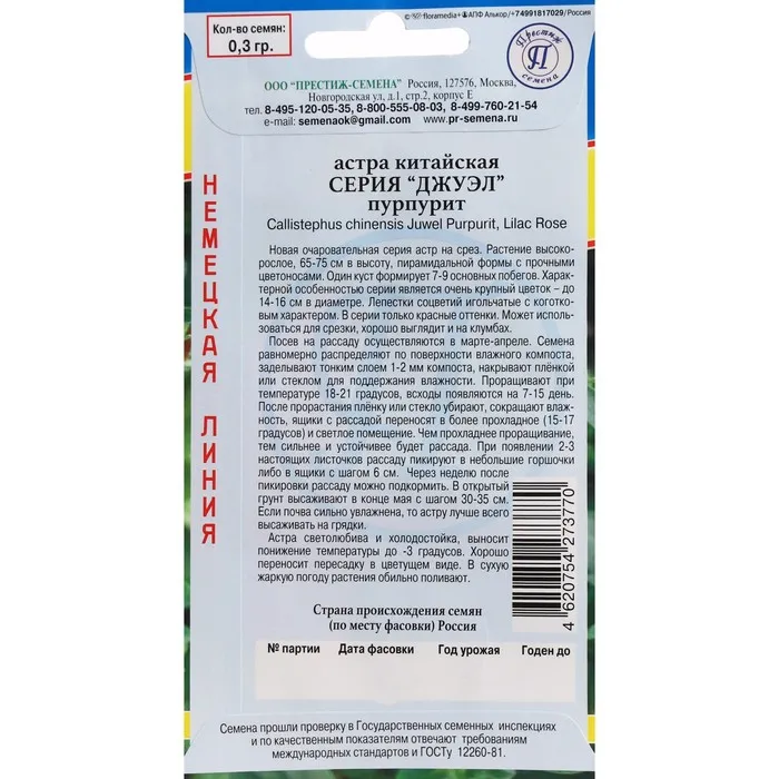 Новая очаровательная серия астр на срез. Растение высокорослое, 65-75 см в высоту, пирамидальной формы с прочными цветоносами. Один куст формирует 7-9 основных побегов. Характерной особенностью серии является очень крупный цветок – до 14-16 см в диаметре. Лепестки соцветий игольчатые с коготковым характером. В серии только красные оттенки. Может использоваться для срезки, хорошо выглядит и на клумбах. Посев на рассаду осуществляют в марте-апреле. Семена равномерно распределяют по поверхности влажного компоста, заделывают тонким слоем 1-2 мм компоста, накрывают плёнкой или стеклом для поддержания влажности. Проращивают при температуре 18-21 градусов, всходы появляются на 7-15 день. После прорастания плёнку или стекло убирают, сокращают влажность, ящики с рассадой переносят в более прохладное (15-17 градусов) и светлое помещение. Чем прохладнее проращивание, тем сильнее и устойчивее будет рассада. При появлении 2-3 настоящих листочков рассаду пикируют в не большие горшочки либо в ящики с шагом 6 см. Через неделю после пикировки рассаду можно подкормить. В открытый грунт высаживают в конце мая с шагом 30-35 см. Если почва сильно увлажнена, то астру лучше всего высаживать на грядки. Астра светолюбива и холодостойка, выносит понижение температуры до -3 градусов. Хорошо переносит пересадку в цветущем виде. В сухую жаркую погоду растение обильно поливают.